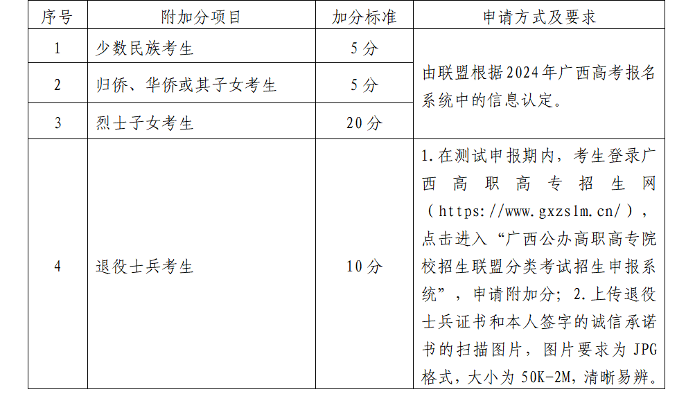 说明:①表中附加分项目及加分标准仅适用于本次联盟院校的高职单招、退役军人单招联合测试;②同一考生符合多项加分条件的,只按其中最高一项加分分值计入总成绩。