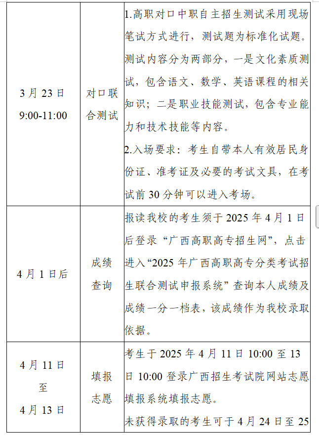第二十一条 已参加“广西高职高专招生联盟”统一测试并取得相应测试成绩的考生,须于2025年4月11日10:00至13日10:00登录“广西招生考试院”网站,志愿填报系统填报相应类别的志愿,没有填报志愿的考生视为放弃当年高职对口中职自主招生录取资格。根据招生计划完成情况设置征集志愿,未获得录取的考生可于2025年4月24日10:00至25日10:00再次登录“广西招生考试院”网站志愿填报系统填报征集志愿。