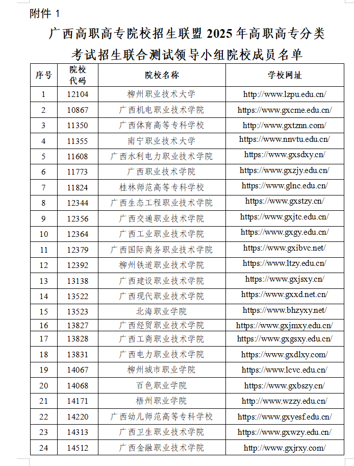 1.广西高职高专院校招生联盟2025年高职高专分类考试招生联合测试领导小组院校成员名单