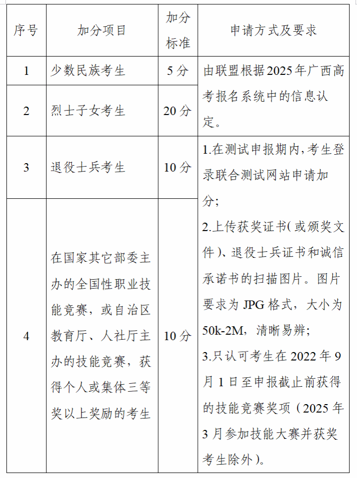 说明:①表中加分项目及加分标准仅适用于本次联盟院校的高职单招、高职对口考试;②同一考生符合多项加分条件的,只按其中最高一项加分分值计入总成绩;③获得“对口免试生”资格的考生,按照上述加分项目的“第4点”加分分值计入总成绩。