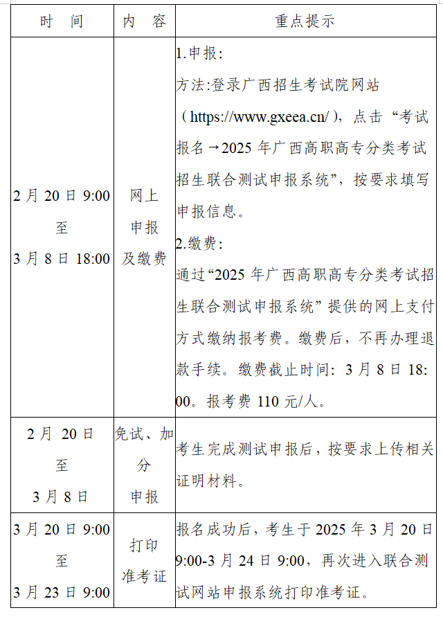 方法:登录广西招生考试院网站(https://www.gxeea.cn/),点击“考试报名→2025年广西高职高专分类考试招生联合测试申报系统”,按要求填写申报信息。