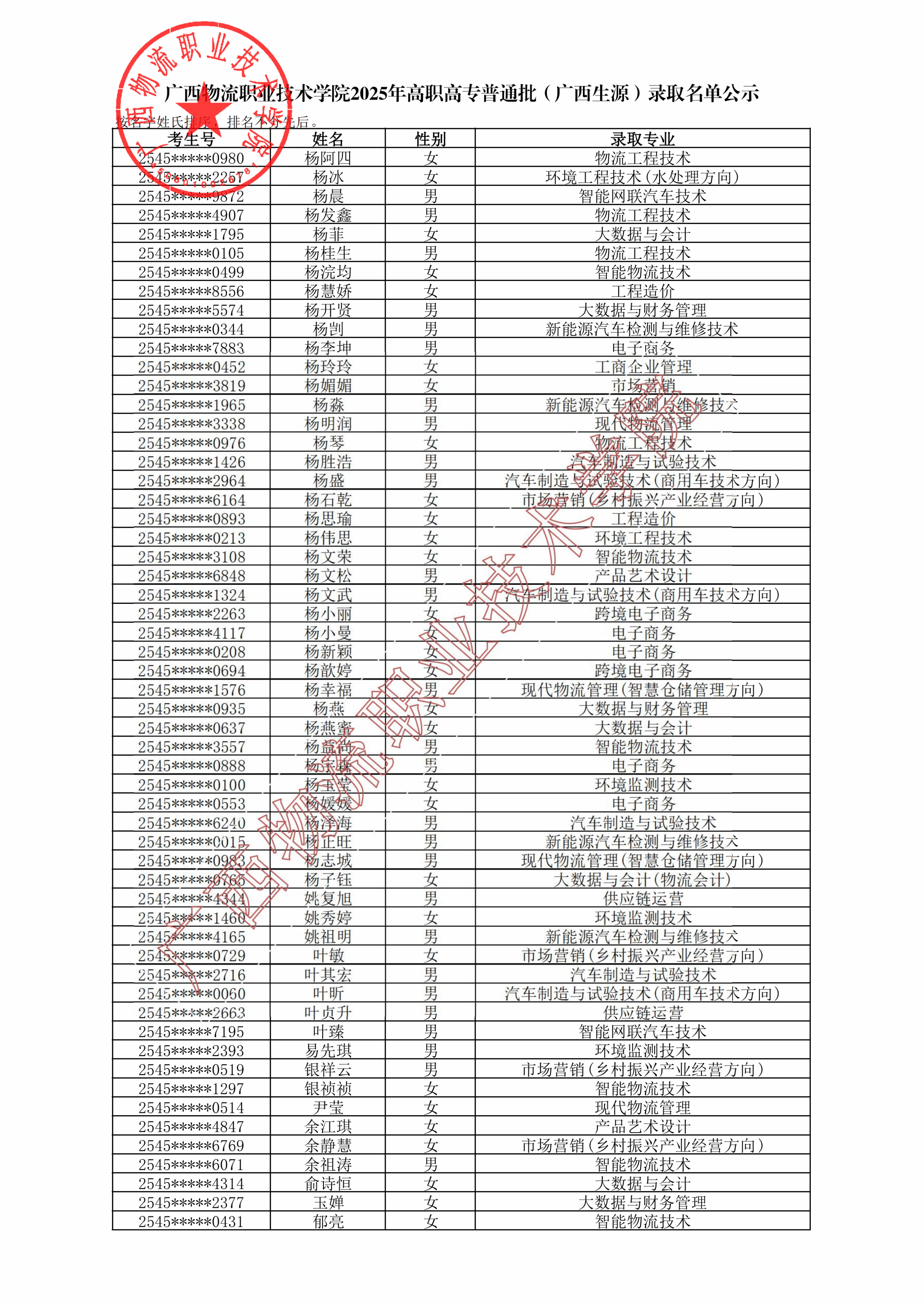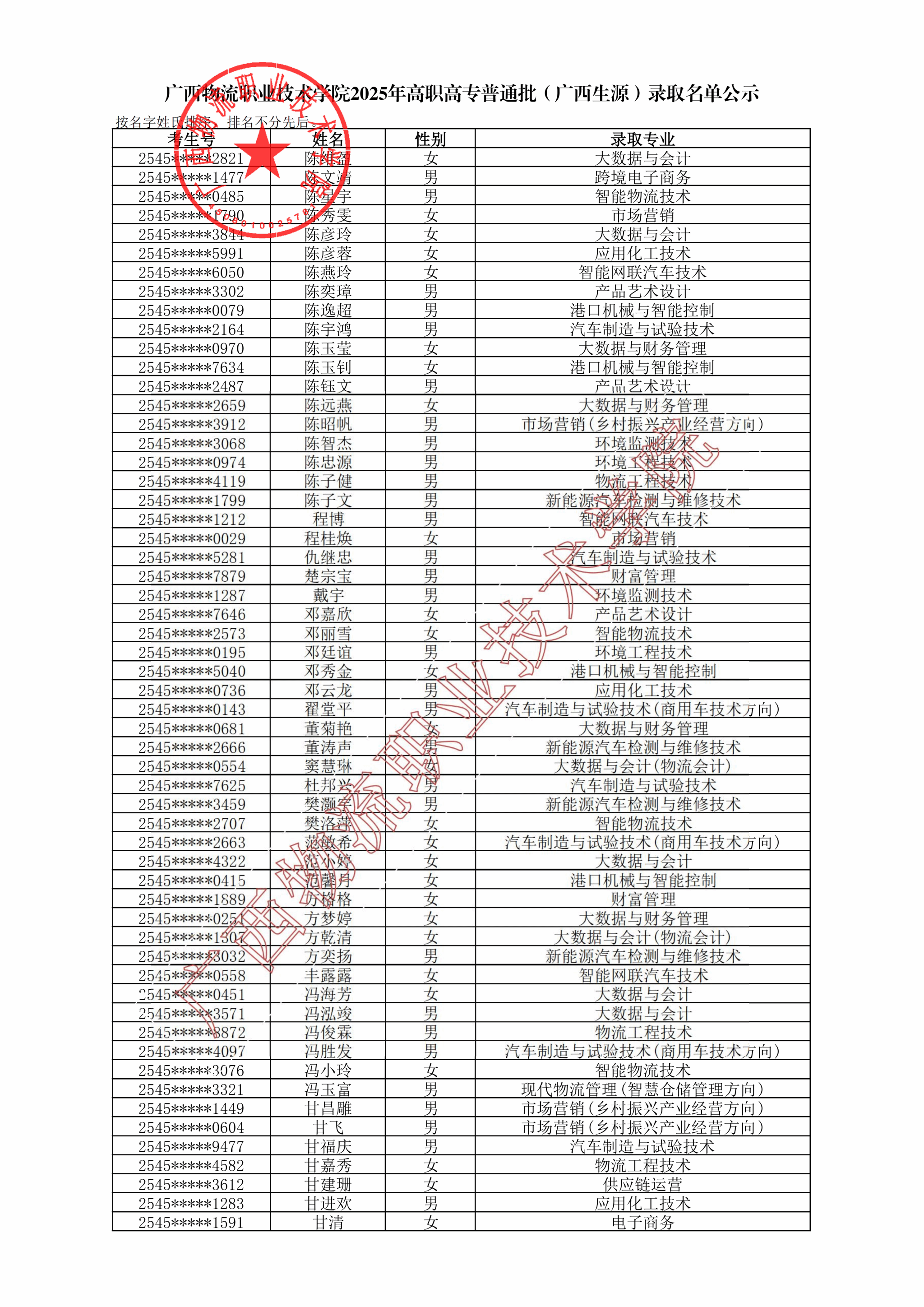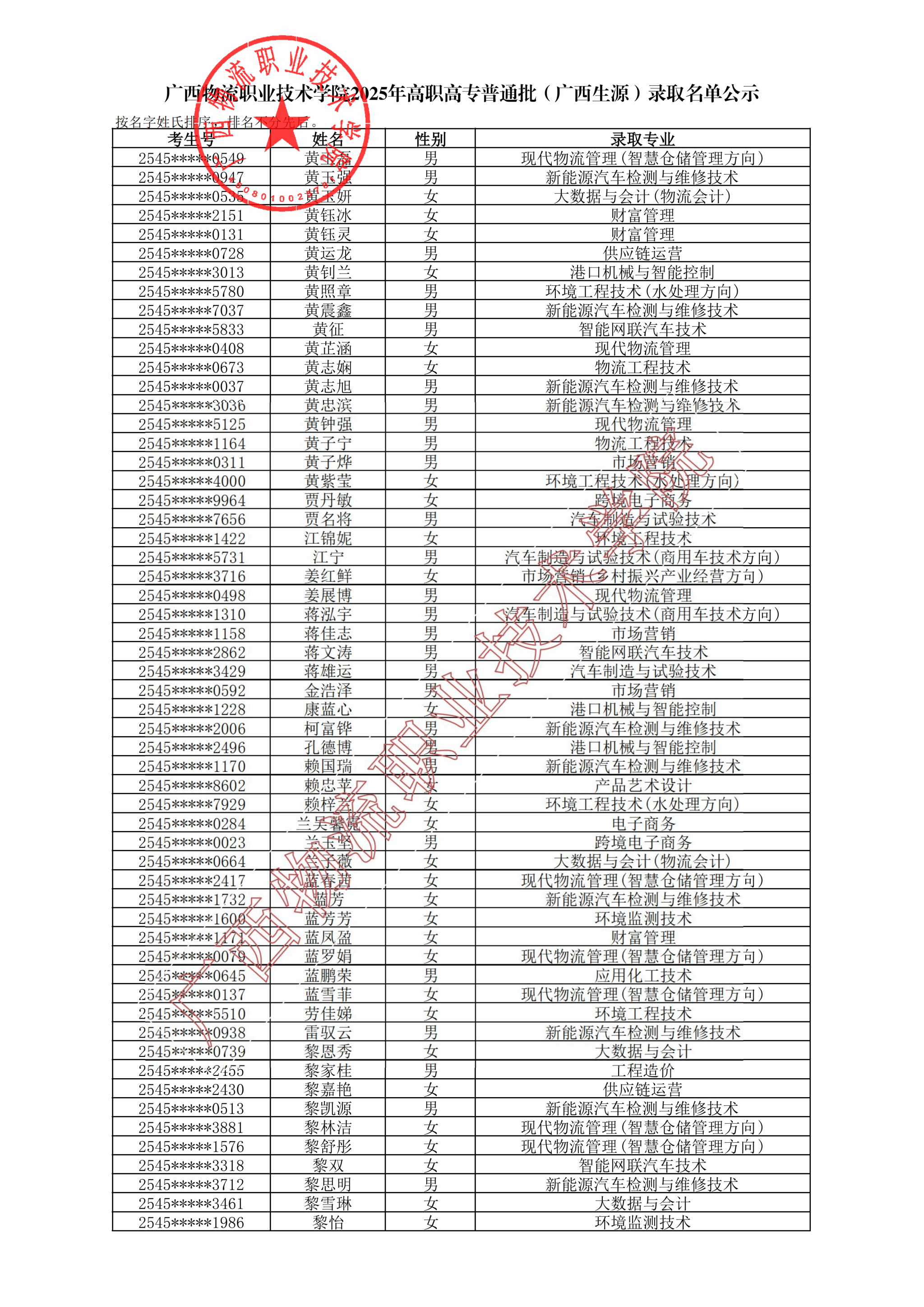 广西物流职业技术学院2025年高职高专普通批(广西生源)录取名单公示