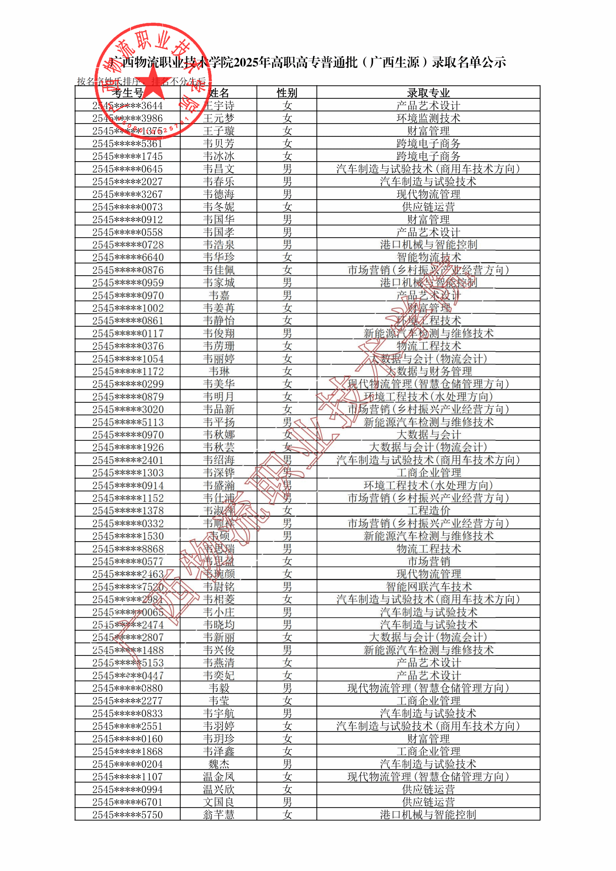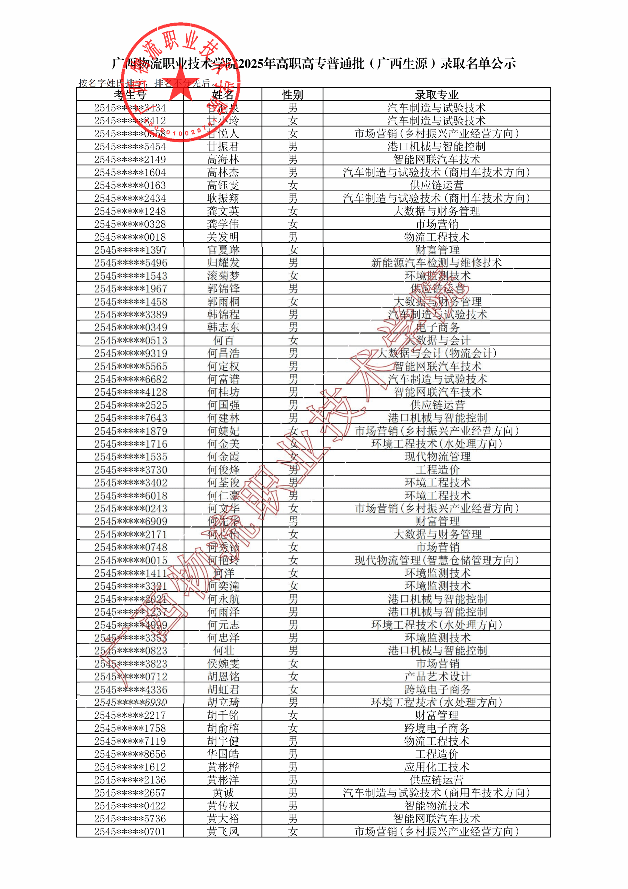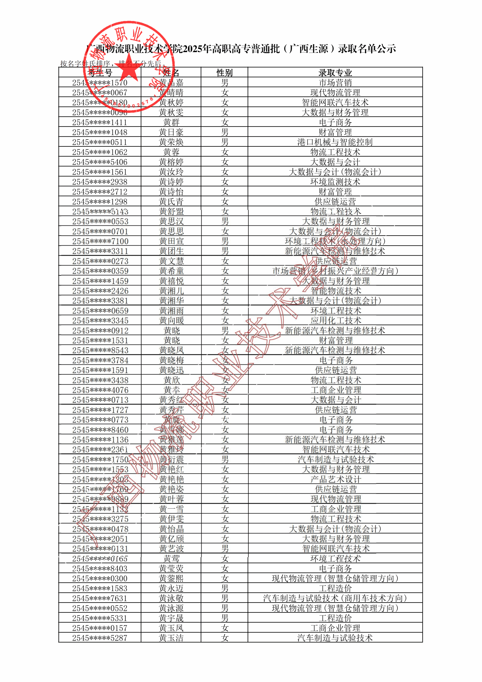 广西物流职业技术学院2025年高职高专普通批(广西生源)录取名单公示