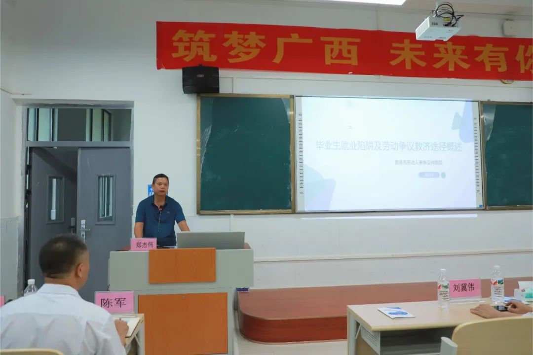 为深入学习贯彻党的二十大精神,落实党中央和自治区关于高校毕业生就业工作决策部署,抓住高校毕业生就业工作关键期,促进我校毕业生顺利就业,6月7日,学院举办筑梦广西·未来有你——就业创业政策宣讲活动。学院党委书记韦光茂出席活动并致辞。贵港市人力资源和社会保障局党组成员、副局长刘冀伟,贵港市劳动人事争议仲裁院院长郑杰伟出席活动,并为学生讲解就业相关知识。招生与就业办公室主任陈军主持活动。