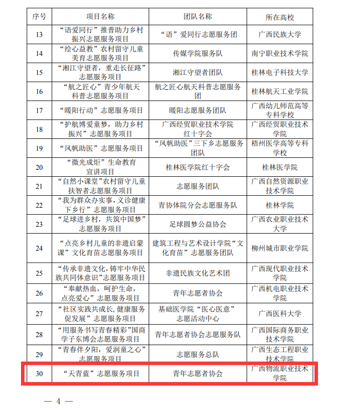 近日,自治区党委教育工委办公室下发了《自治区党委教育工委办公室关于公布2023年广西高校大学生志愿服务优秀项目的通知》,全区高校共30个志愿服务项目入选。我校“天青蓝”志愿服务项目成功入选,这是我校第一支入选自治区级的志愿服务项目。