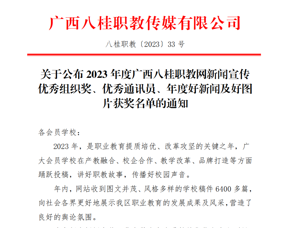 近日,广西八桂职教网公布了2023年度新闻宣传优秀组织奖、优秀通讯员、年度好新闻及好图片获奖名单,我校获得以下荣誉: