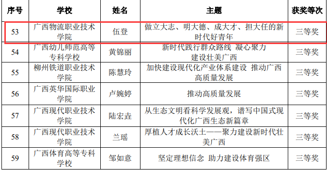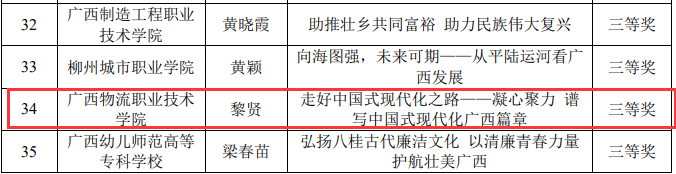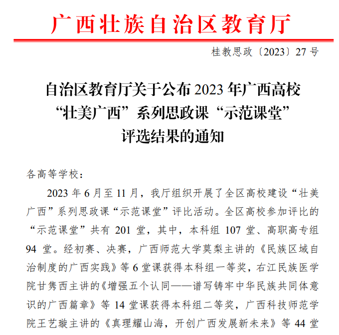 近日,自治区教育厅下发了《自治区教育厅关于公布2023年广西高校“壮美广西”系列思政课“示范课堂”评选结果的通知》,我校马克思主义学院黎贤老师、伍登老师均荣获高职高专组三等奖!