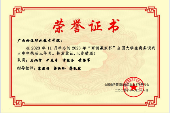 近日,2023年“商谈赢家杯”全国大学生商务谈判大赛赛程落下帷幕。本届大赛吸引了全国40余所高校160余支队伍同场竞技。我校人文教育学院组织的四支队伍分别荣获大赛(网络赛高职组)一等奖1项、二等奖1项、三等奖2项,其中谢金蕙获得“优秀谈判手”称号。