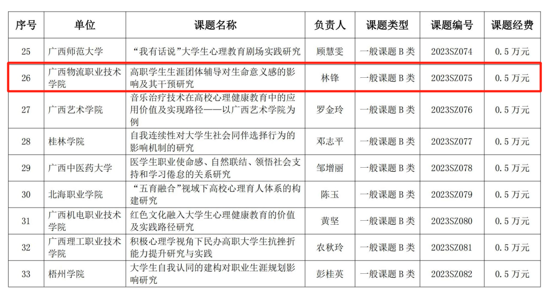 根据《自治区教育厅关于公布2023年广西高校大学生思想政治教育理论与实践研究课题立项名单的通知》,确定2023年广西高校大学生思想政治教育理论与实践研究课题349项。其中,重点课题35项、一般课题A类105项、一般课题B类209项。我校