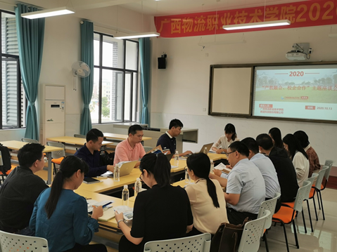 为深化产教融合,推进校企合作,培养一批专业知识扎实、实践能力强、具有良好职业道德的高层次技能应用型人才,促进物流商学院人才培养高质量发展,2020年10月13日,广西物流职业技术学院物流商学院(以下简称“商学院”)和新道科技股份有限公司(以下简称“新道科技”)在宜贵北楼202教室共同召开座谈会。商学院负责人梁杰、交通学院负责人莫军、教务处负责人卢澄林、商学院全体教师和新道科技广西区总经理黄堪敬、副总经理吴征科、解决方案顾问黄河景等参加座谈。座谈会由商学院负责人梁杰主持。