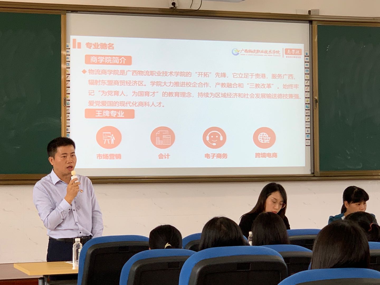 活动伊始,物流商学院负责人梁杰老师详细介绍广西物流职业技术学院(简称“广物院”)及物流商学院的发展历程,并对各专业学生加入物流商学院,成为“商人”表示深切地祝贺,寄语同学们扎根专业学习,提升职业技能,做新时代发展的“四有青年”。同时鼓励同学们开拓视野,把自身的发展与学校、专业发展结合起来,善做“商人”,秉承物流商学院“商者无域,知行致远”办学理念,物流商学院将为同学们创设“商海名师讲堂”“岗位技能知识竞赛”“读书分享会”等系列活动,让人人有名师指点迷津,人人成才,不虚此行。