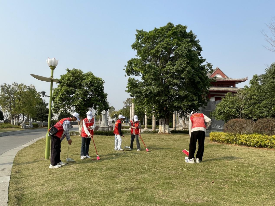 ▲志愿服务队伍深入贵港市园博园,清扫地面垃圾、清理杂物及卫生死角