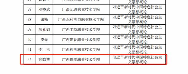 根据《自治区教育厅关于公布的 2024 年广西高校思想政治理论课教师教学基本功比赛暨“精彩一课”评选活动获奖名单的通知》,我校马克思主义学院吕晓艳、甘昭燕两位老师均获二等奖此次获奖实现了我校在此项比赛上的突破!