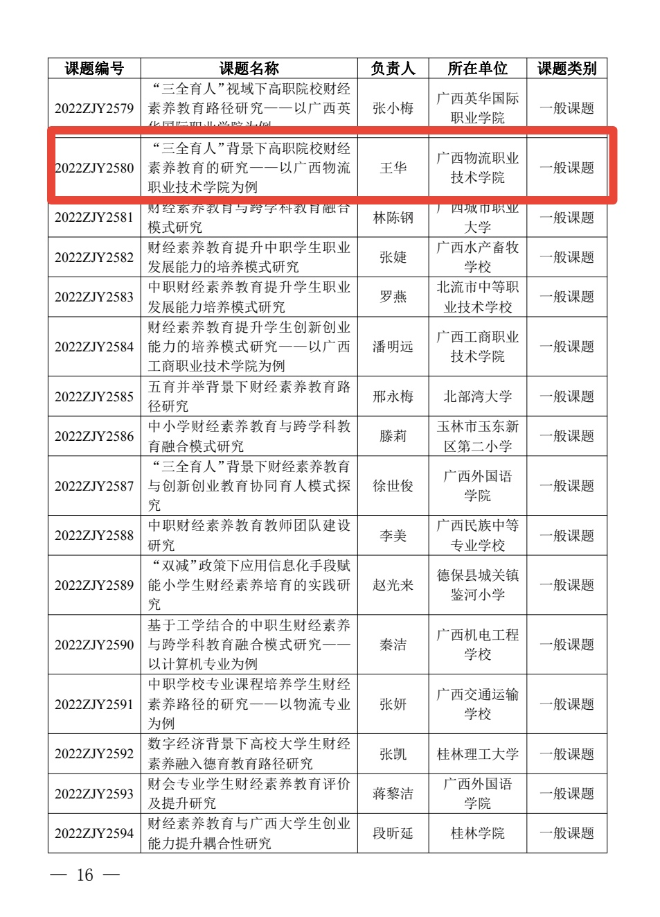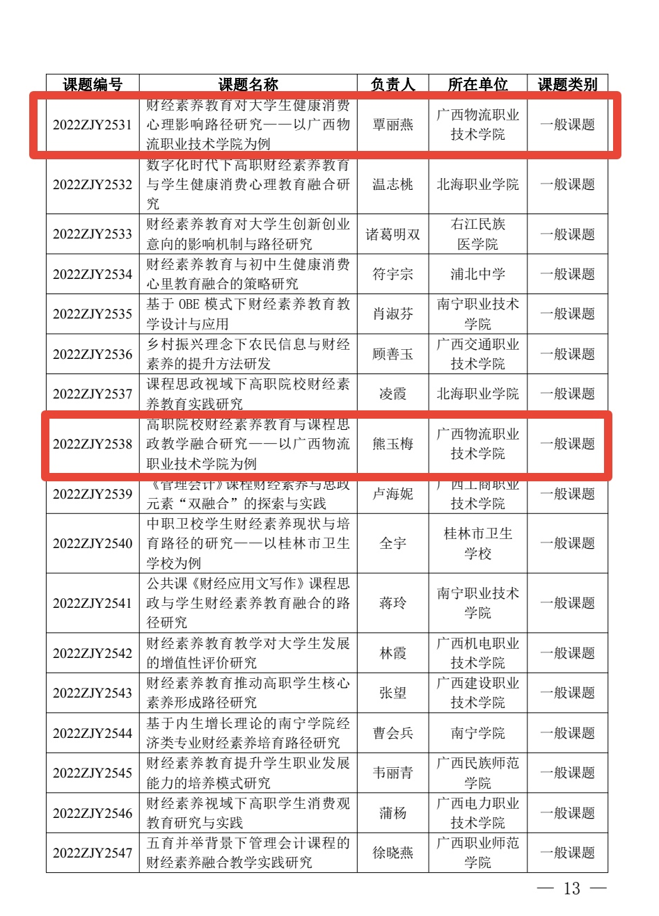 根据《广西教育科学规划领导小组关于公布广西教育科学“十四五”规划2022年度广西财经素养教育研究专项课题立项名单的通知》(桂教科学〔2022〕38号),设立2022年度广西财经素养教育研究专项课题217项,其中重点课题53项,一般课题164项。我校覃丽燕、熊玉梅、王华、韦开盛四位老师主持申报的课题均喜获立项。
